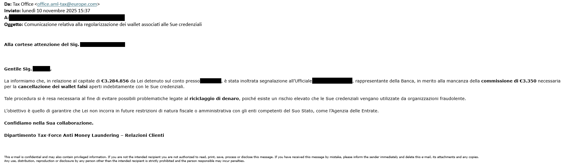 Ulteriore segnalazione di phishing in circolazione. Con l’avviso del 14 novembre 2025 l’Agenzia avverte i cittadini su nuovi tentativi di truffa che hanno a tema la regolarizzazione di wallet di criptovalute. Il mezzo è ancora una volta la posta elettronica. I tentativi avvengono tramite recapito di e-mail da un sedicente Dipartimento Tax-Force Anti Money Laundering, del quale è impossibile trovare un riscontro dell’effettiva esistenza.