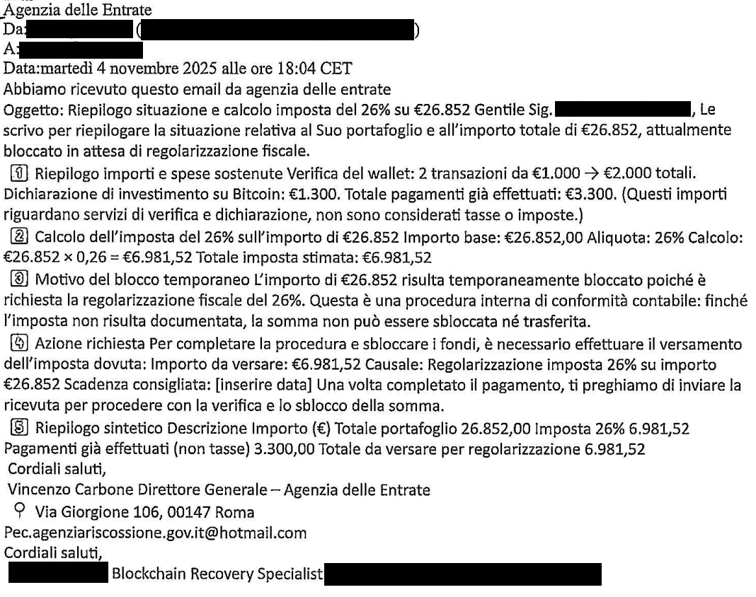 Segnalato un ennesimo tentativo di truffa ai danni dei cittadini. Oggi si tratta di e-mail che sfruttano indebitamente il nome dell’Agenzia stessa e del suo direttore, con l’obiettivo di ottenere pagamenti non dovuti. In tali comunicazioni, attribuite falsamente al direttore, vengono indicate presunte irregolarità legate a investimenti in criptovalute. Ecco un esempio: