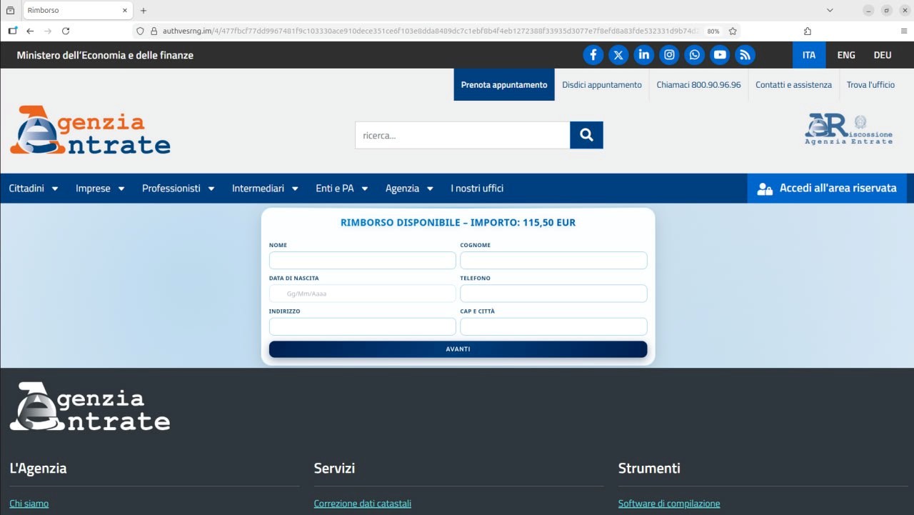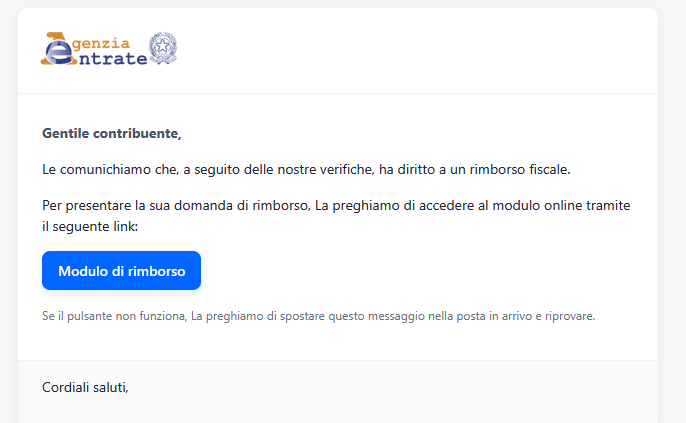 Nel testo è presente un pulsante Modulo Rimborso, che indirizza a una pagina che simula il sito istituzionale dell’Agenzia e prospetta un presunto rimborso di 115,50 euro. Inoltre, sotto il pulsante è presente un messaggio che invita l’utente a spostare la mail fraudolenta nella cartella della propria posta in arrivo e riprovare la procedura, qualora il pulsante non funzionasse.A seguire il contenuto del messaggio in circolazione: