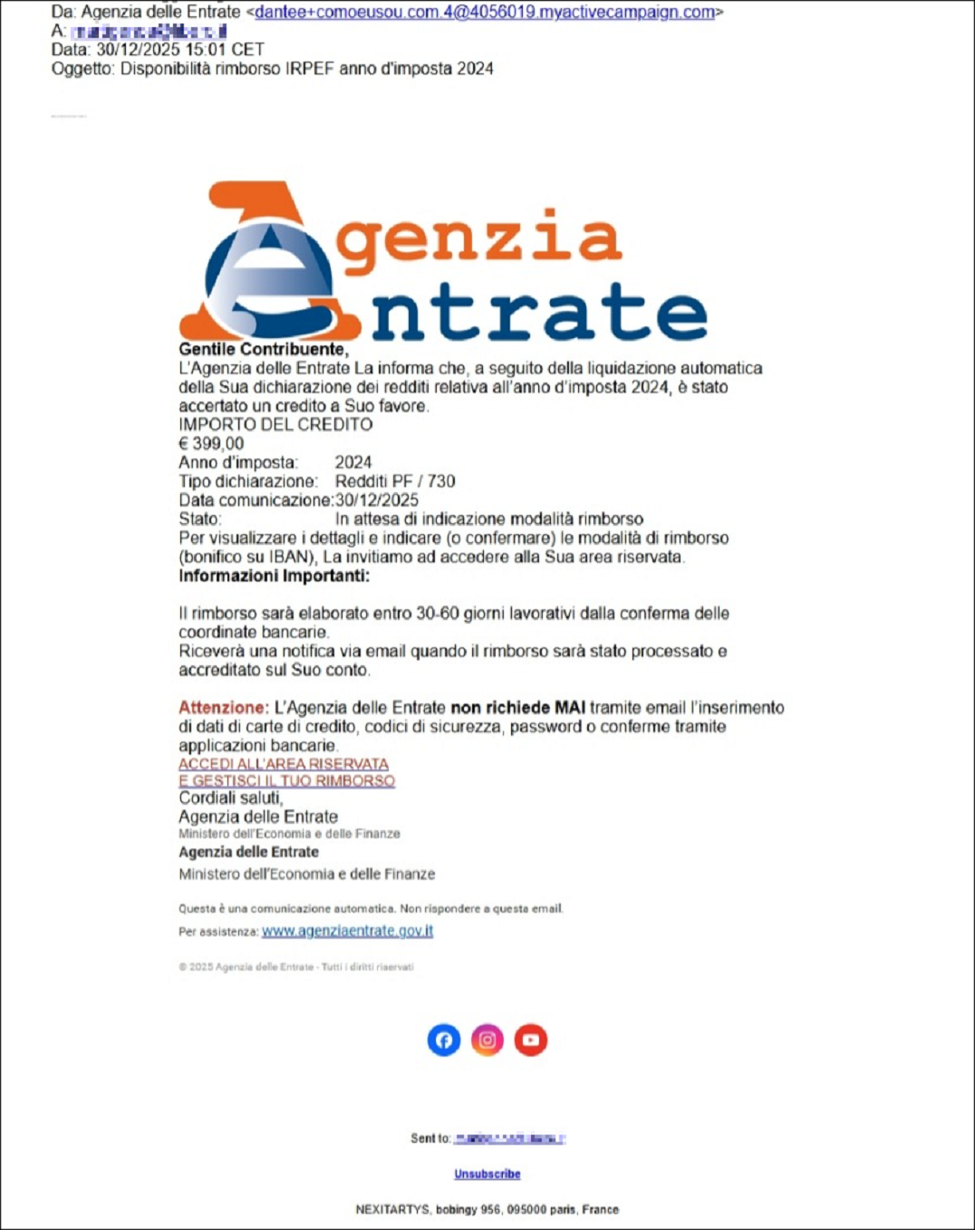 Classico il tema della seconda campagna di phishing segnalata dall’Agenzia, tornano i falsi rimborsi. I destinatari ricevono una “raffinata” mail che li informa di un rimborso dovuto a un’eccedenza di Irpef versata, aggiungendo, subito dopo, un disclaimer secondo cui l’Agenzia “non richiede MAI tramite e-mail l’inserimento di dati di carte di credito, codici di sicurezza, password o conferme tramite applicazioni bancarie”. Il messaggio rinvia poi, per la “gestione” del rimborso, a un link – naturalmente malevolo ed estraneo all’Agenzia delle entrate – che collega all’area riservata di un falso portale dell’Agenzia.