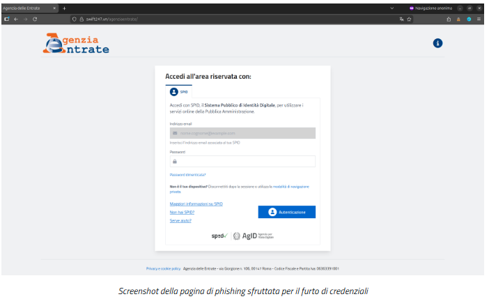 Alla vittima viene chiesto di inserire la password della propria identità digitale, mentre l’indirizzo mail è già precompilato tramite personalizzazione del link Una nuova truffa online cerca di sfruttare il logo dell’Agenzia delle entrate con l’intento di sottrarre le credenziali Spid (sistema pubblico di identità digitale) degli utenti.