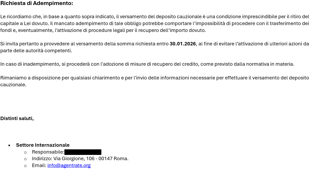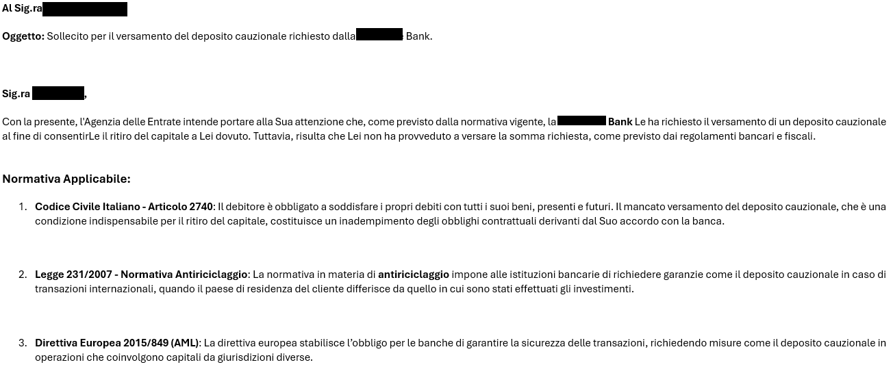 Un falso sollecito comunica al destinatario la necessità di versare un deposito cauzionale presso una banca, elencando una serie di normative che imporrebbero l’adempimento