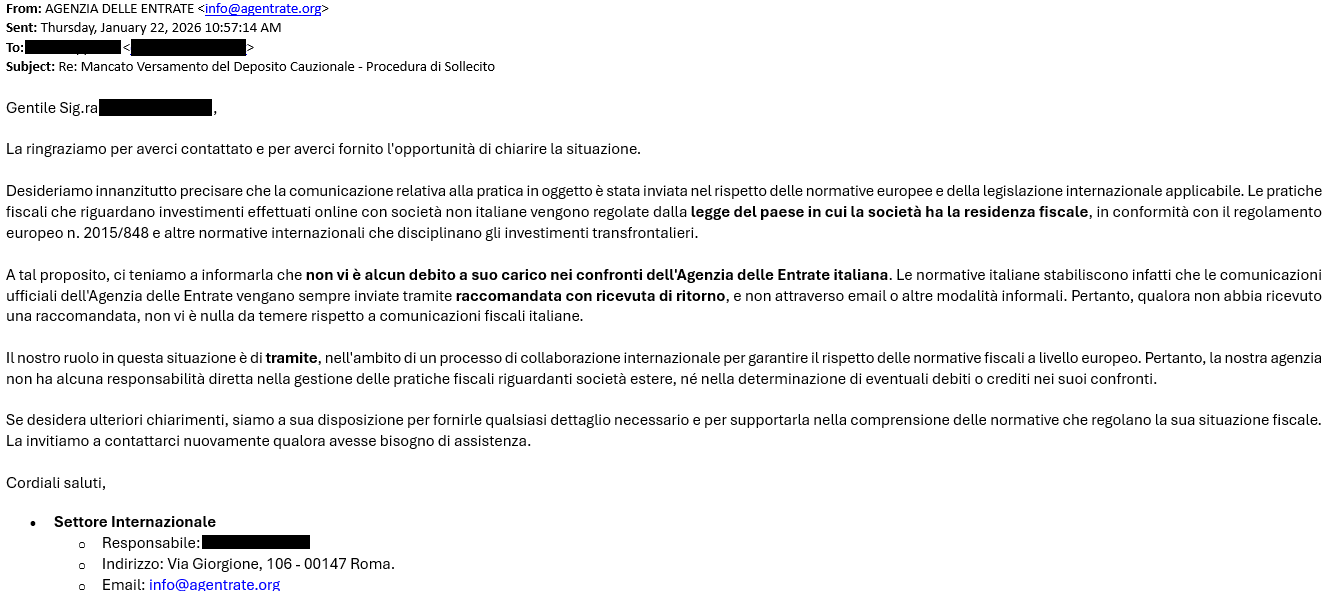 Come si evince dall’immagine sopra riportata, in questo falso sollecito viene spiegato che è necessario versare un deposito cauzionale presso una nota banca, elencando una serie di normative che imporrebbero la richiesta di adempimento, altrimenti non sarà possibile ritirare il capitale dovuto. Inoltre, nell’ipotesi in cui questa richiesta non venga evasa entro una breve scadenza, viene paventata la possibilità di un recupero coattivo del credito. Particolarità di questa campagna di phishing è qualora il destinatario risponda in maniera scettica al truffatore, quest’ultimo invia un messaggio come il seguente: